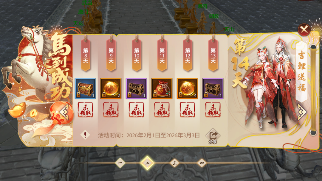 2月的新春好气象,就从每日签到开始!记得每天都来上线点一点,福利不漏领,轻轻松松把时装与坐骑一起带回家~