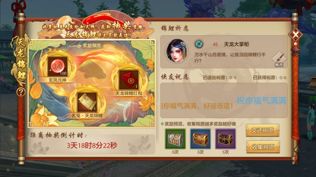 2月27日至3月2日期间,少侠可参与锦鲤祈愿活动,收集侠友们的真挚祝愿,将这份满满的心意上交赵天师,不仅能解锁丰厚的祈愿奖励,更能获得锦鲤抽奖资格,静待终极好运降临!
