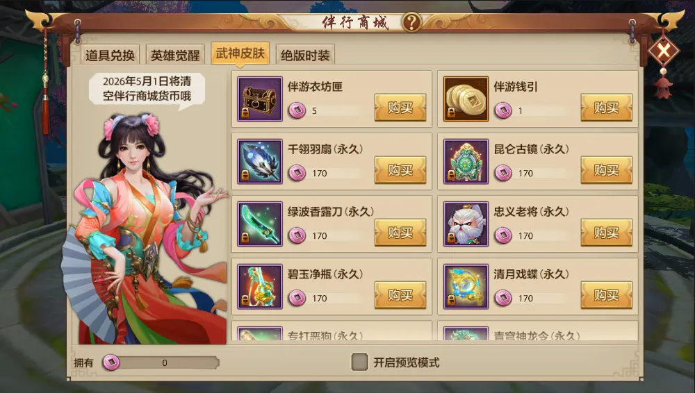 伴行商城也将同步开启,本期上架好物包括:神器幻化「千翎羽扇」、天山童姥觉醒材料「六阳掌谱」等好物。
