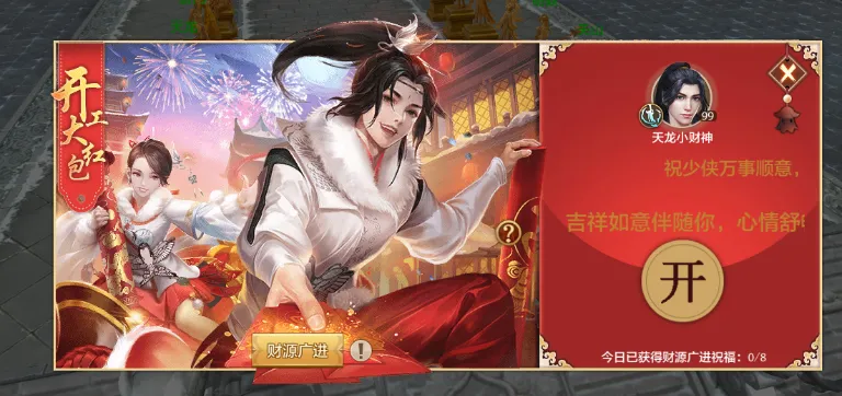 活动期间,少侠只需收集“财源广进”祝福,就能开启红包领取丰厚奖励。收集的祝福越多,红包内的福利就越丰厚,绑元奖励拿不停!