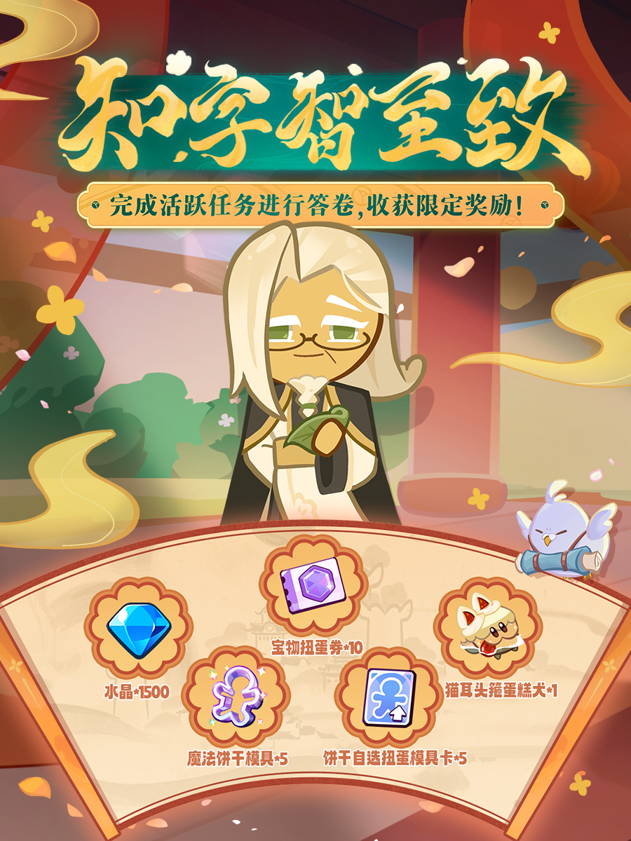活动持续期间,饼干朋友们可以使用通过【行万里路】模块和【读万卷书】模块获得的「知识灵感(字)」填充答卷。正确完成本章节所有问题后,可领取章节大奖。完成所有答卷,可累计获得「自选扭蛋模具卡」、「水晶」,限定装饰「猫耳头箍蛋糕犬」等大量奖励!