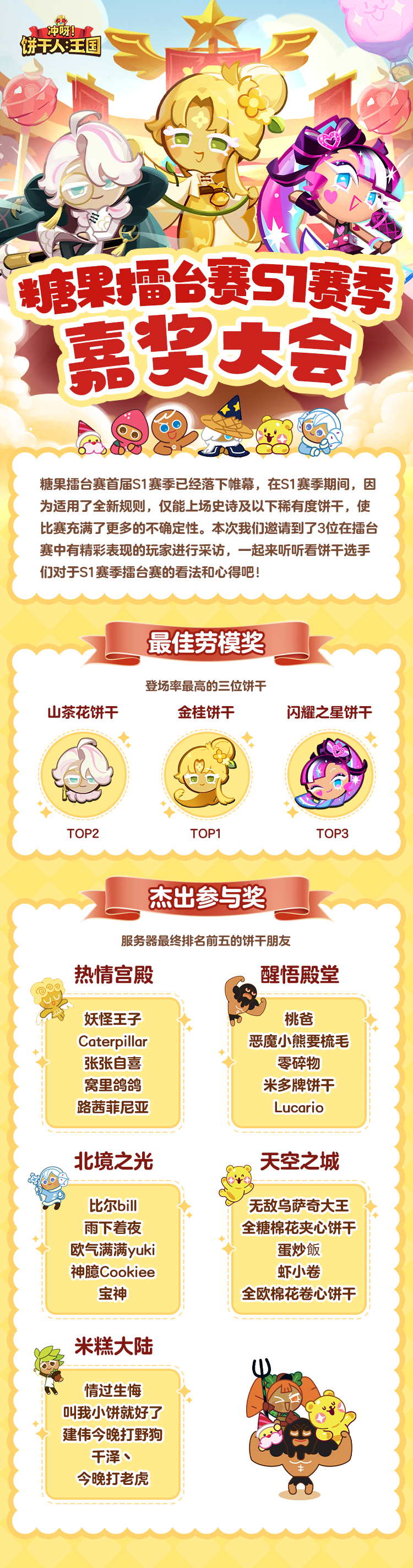 在S1赛季期间,特殊的规则下,更多的饼干朋友投入到的擂台赛的角逐当中,史诗及以下的饼干大放异彩!通过本期嘉奖大会,来回顾这些难忘瞬间、学习更多干货!