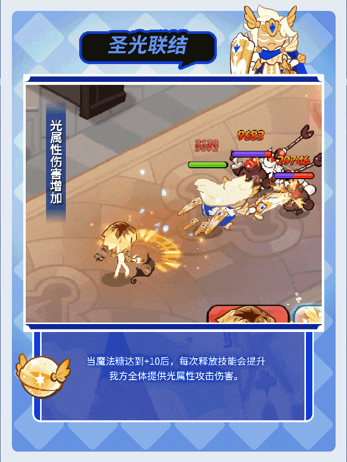 获得光之力量强化自身,普通攻击造成额外伤害,且每攻击一定次数后发射更为强大的光之力量攻击敌方,并恢复自身生命值,技能结束后,自身获得生命值护盾。