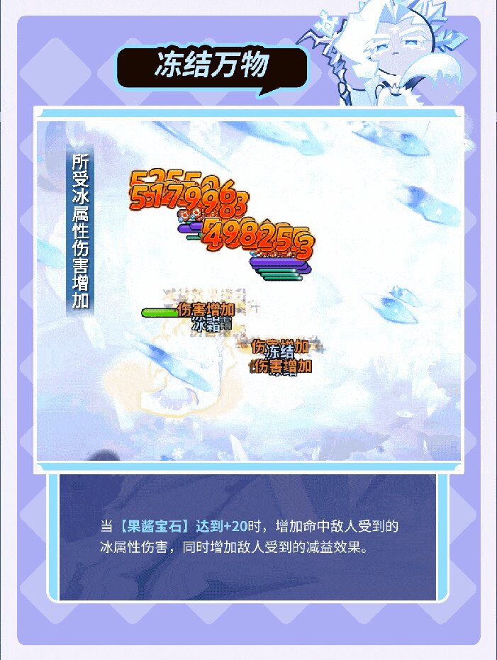 果酱宝石使冰霜的力量变得更强大,技能不会受到攻速增减效果影响。释放技能时掀起暴风雪攻击敌人,附加冰霜减益效果,最后一击会掉落万年雪雪球造成额外伤害,并附加冻结状态。如果敌人未进入冻结状态,则会附加寒气减益效果,降低防御力与移动速度,当寒气积累到可进入冻结状态时,寒气会转为发动冻结效果。与雪酪饼干一同出战时可触发额外效果,提升自身伤害减免与生命值。