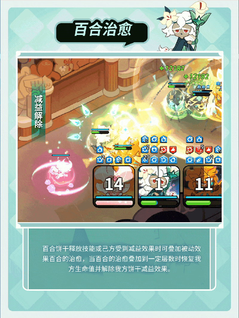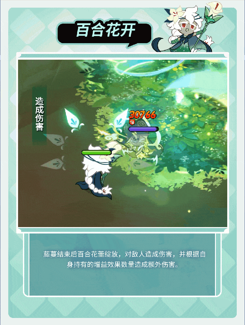 用藤蔓捆住敌方,使其无法移动与释放技能,藤蔓束缚结束或敌人免疫控制时,造成伤害并给予受到伤害增加与移动速度减缓效果。随后百合花绽放对敌人造成伤害,并根据自身持有增益效果数量造成额外伤害。当百合饼干释放技能或我方饼干遭受减益攻击时获得百合治愈效果,百合治愈效果叠加到一定层数时解除我方饼干减益效果并恢复生命值。