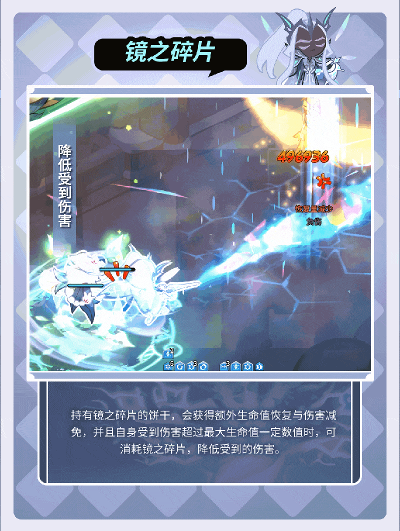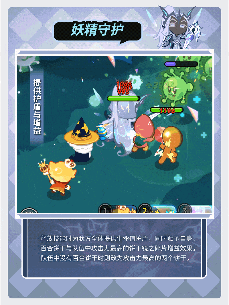 举剑凝聚能量,挑衅敌人并解除自身减益效果,随后对敌人挥剑,剑中凝聚的能量爆炸对敌人造成伤害,附加负伤与恢复减少效果。释放技能时为我方全体提供生命值护盾,自身增益数量越多,护盾值越高。同时赋予自身、百合饼干与攻击力最高的一个饼干镜之碎片增益,如没有百合饼干则改为攻击力最高的两个饼干。当持有的脆饼附加效果为生命值时,可增加镜之碎片赋予的数量,妖精王饼干受到减益效果时,自身伤害减免增加。