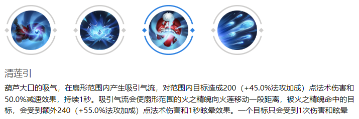 火莲的葫芦在扇形范围内产生吸引气流,对范围内的目标造成法术伤害和减速效果。当敌方被火之精魄命中后会受到法术伤害并赋予眩晕效果。清莲引是火莲的关键控制技能,可用于先手开团、保护队友或反制敌方突进。