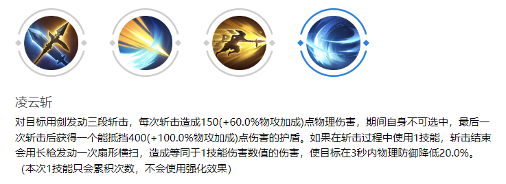 凌云斩:作为花木兰的标志性技能之一,她以精湛的剑术对敌人进行三次精准的剑斩,每一次斩击都给敌人带来巨大的伤害。在施展这一技能期间,花木兰仿佛身披坚不可摧的护甲,能够免疫所有控制效果,确保她能够在战场上自由进退,游刃有余。当最后一击落下时,花木兰不仅完成了对敌人的重创,还将获得一个护盾,为她提供额外的保护,使她在接下来的战斗中更加从容不迫。若在剑斩过程中巧妙地使用一技能,斩击结束后,花木兰将切换至长枪形态,施展一次横扫。这一横扫会造成与一技能相同的伤害,还能够削弱敌人的物理防御。
