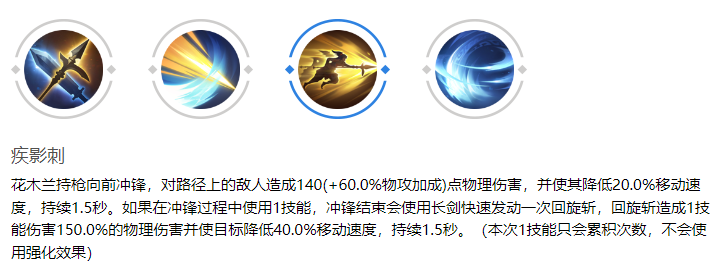 疾影刺:花木兰对前方的敌人造成伤害,并降低其移动速度。如果在冲锋过程中使用1技能,冲锋结束后她将迅速以长剑发动一次回旋斩,造成物理伤害,并降低目标的移动速度。这种流畅的攻击转换使她在战场上如鱼得水。