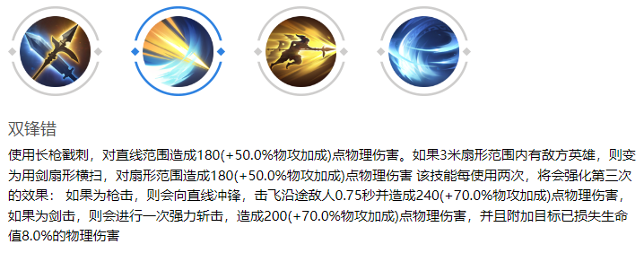 双锋错:这一技能让花木兰以长枪进行戳刺攻击,对直线范围内的敌人造成物理伤害。若前方扇形区域内有敌方英雄,则改为用剑进行横扫,对范围内的敌人造成伤害。每使用该技能两次后,第三次将得到强化:若为枪击,她将向直线方向冲锋,击飞沿途敌人并造成物理伤害;若为剑击,她会进行一次强力斩击,不仅造成伤害,还会根据目标已损失的生命值附加额外伤害。这种多变的攻击方式让敌人在她面前难以招架。