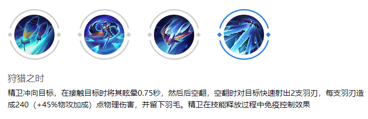 通过普攻迅速积累8根羽毛后,施展一技能的二段效果来回收这些羽毛,对单一目标制造巨大的爆发伤害(当3根或以上羽毛命中时,会触发减速效果)。巧妙地运用二技能的位移调整自己的站位,保证羽毛的回收路径能够覆盖到更多的敌人。在团战开始前,先利用普攻预先储存羽毛,在进入战场后立刻释放一技能,以造成群体减速和高额伤害。