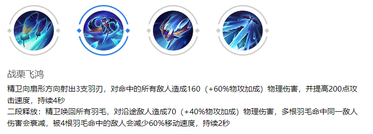 开启技能后,精卫获得高额攻速加成,快速叠加羽毛数量。技能结束或主动释放二段时,所有羽毛将被召回,对路径敌人造成贯穿伤害。