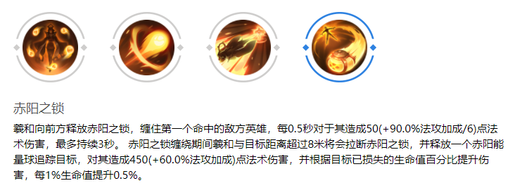 二技能“烈阳突袭”赋予了羲和卓越的机动性。第一段突进配合三枚火球群伤,并附带目标伤害衰减机制,这使他能够快速接近目标进行爆发输出,也能在团战中灵活调整站位;4秒内的回溯机制更是让羲和能够灵活应对各种战场情况,无论是追击残血、支援队友还是规避致命伤害,都能游刃有余。三技能“赤阳之锁”是羲和的招牌控制与斩杀技能,超远距离锁定单体持续伤害,并具备百分比斩杀效果,使他在单挑和残局收割中得心应手。然而,玩家需要精准把控8米的临界距离,选择维持锁链持续输出还是故意拉断触发额外斩杀,这考验了玩家对距离感和战场局势的判断。