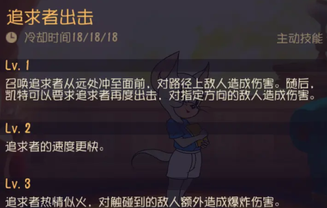 主动技能“追求者出击”:兼具远程消耗与范围控制能力。该技能可先手打击老鼠,压低其血量;后期升级后更附带控制效果,无论是远程狙击还是防守奶酪/墙缝时的范围清场,都能发挥关键作用。