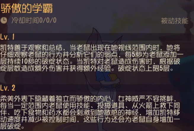 被动技能“骄傲的学霸”:凯特的灵魂机制!靠近老鼠时会自动为其添加“破绽”标记,老鼠可通过观察自身状态判断凯特方位。游戏初期若携带隐身药水,可延迟学习被动,优先利用隐身突袭;中后期则需重点升级,通过高频叠加破绽快速建立等级优势。