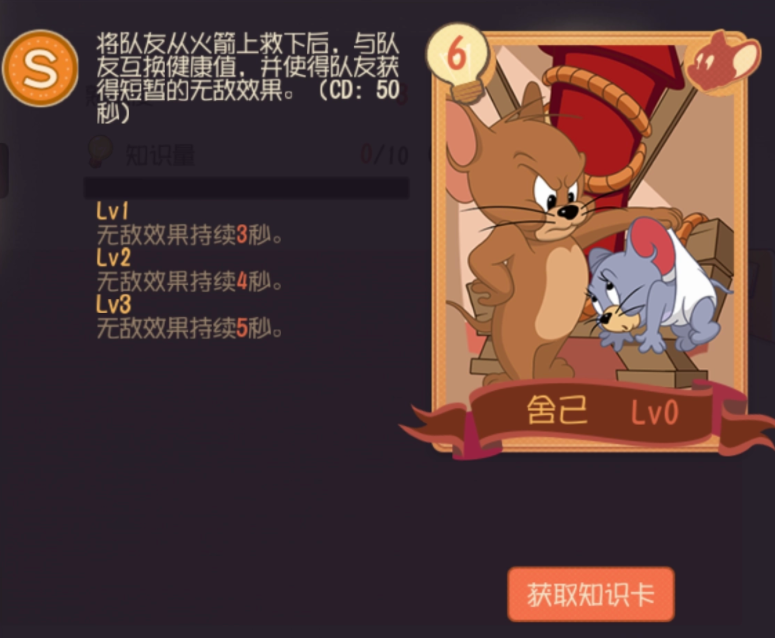 而对于以救援见长的剑客泰菲来说,合理地搭配知识卡尤为重要。推荐选择“舍己”“飞跃”和“救救我”这三张核心卡。“舍己”能够在受击后快速恢复生命值,从而提升持续作战的能力;“飞跃”则可以增强跳跃的高度,便于翻越障碍摆脱追击;“救救我”则延长了被绑火箭后的救援窗口,为队友争取更多的时间。当然,知识卡的选择还需结合具体的地图特点进行灵活调整。在墙体密集的区域,“破墙”卡更具优势;而在障碍繁多的环境中,则更适合使用“闪躲”卡来提升灵活性。因此,玩家应根据自身的风格以及场景的需求来做出最优的配置。