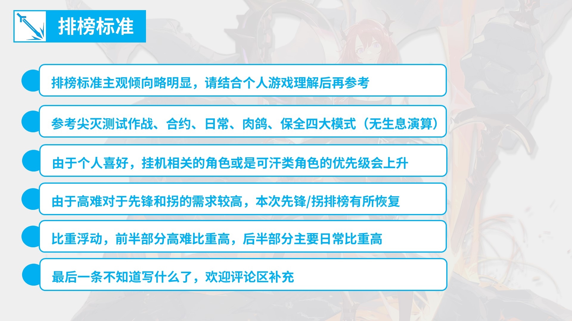 排榜标准:(1)排榜标准主观倾向略明显,请结合个人游戏理解后再参考
