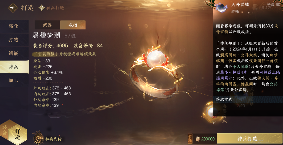 2)橙戒开启:打造-神兵-戒指接取指引任务(获得1个海蜃奇珠和2个天外雷鳞),解锁共需1个海蜃奇珠+20个天外雷鳞合成。