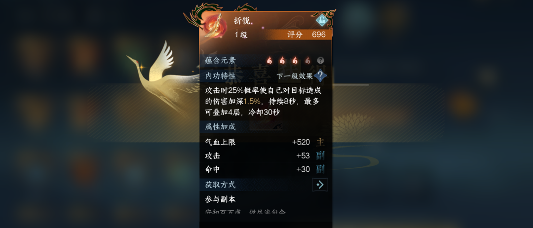 8)定向优质:3个未升级的普通内功兑换为1个随机定向元素(各类元素可首选)内功,每周限购20次,概率开出好词条。这个系统我个人觉得还不错,我换了几个词条不错的内功,另外火系内功也能合成出【众秒】