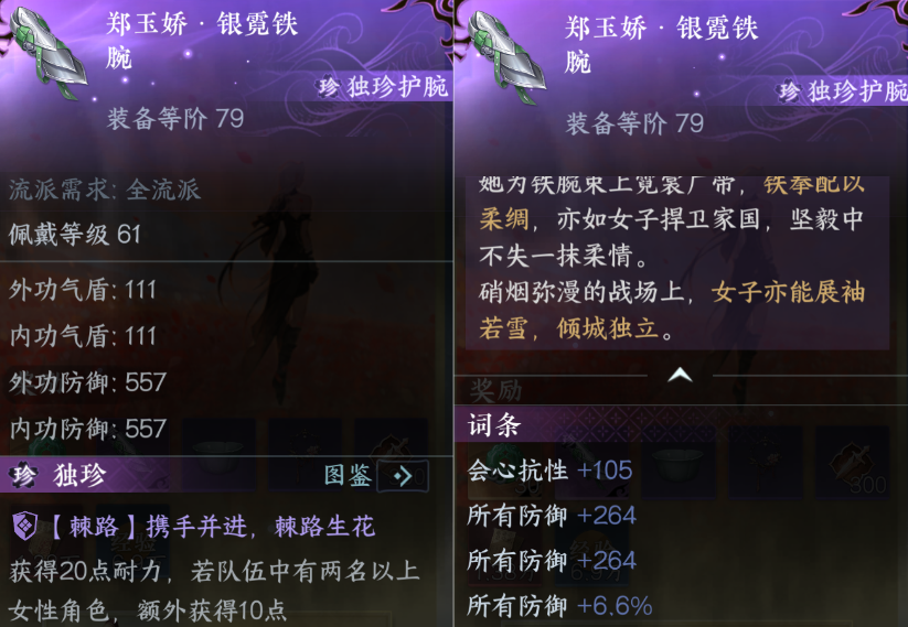 1)郑玉娇·银霓铁腕:接取华章任务【棘路生花】可获得独珍护腕,增加防御,防御百分比和会心抗性,PVP坦度不俗。