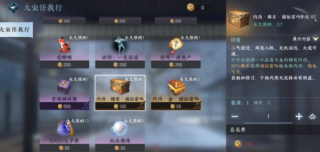 四)大宋任我行:参与可获得风行币以及完成挑战任务,在风行商店可兑换81百炼神兵匣,高概率绝电飞光的稀有内功匣,外观,动作,称号,交子等。