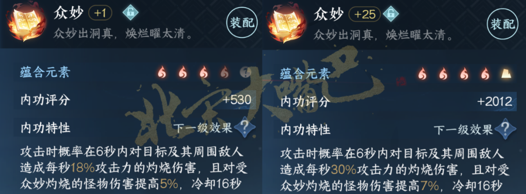 6)全新内功-众妙:攻击时概率在6秒内对目标及其周围敌人造成每秒18%~30%攻击力的灼烧伤害,且对受众妙灼烧的怪物伤害提高5%~7%,冷却16秒