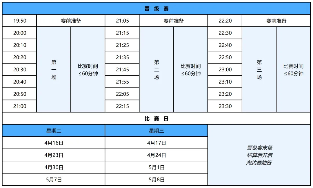 晋级赛目前已将比赛时间调整为4月16日~5月8日期间,每周二、周三的晚间20:00、21:15和22:30三个时间段。参赛者需在此之前10分钟确认参赛(见A2)。