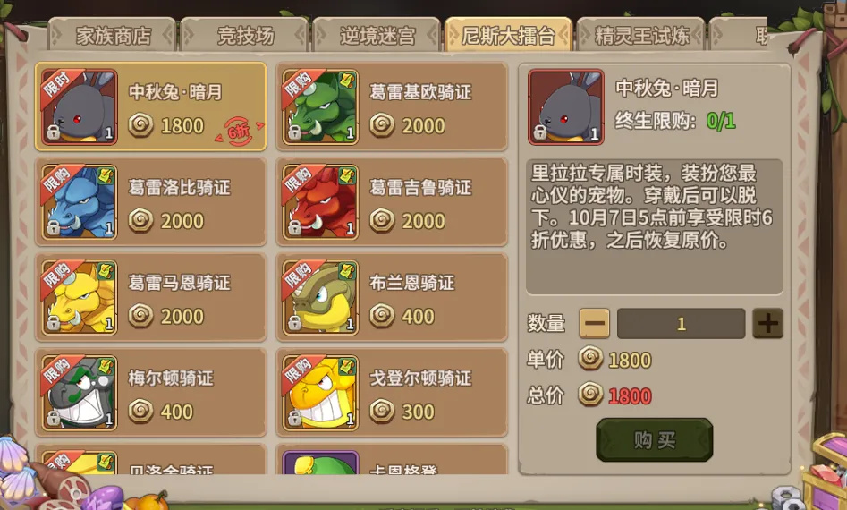 尼斯大擂台商城,10月7日5:00前限时6折优惠,仅需1800擂台币即可兑换。折扣期间限兑换1次。
