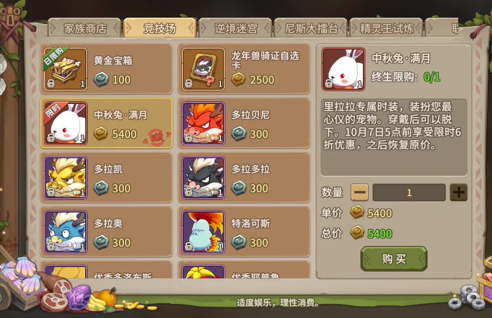 竞技场兑换商城,在10月7日5:00前限时6折优惠,仅需5400荣誉勋章可以兑换;折扣期间限兑换1次。