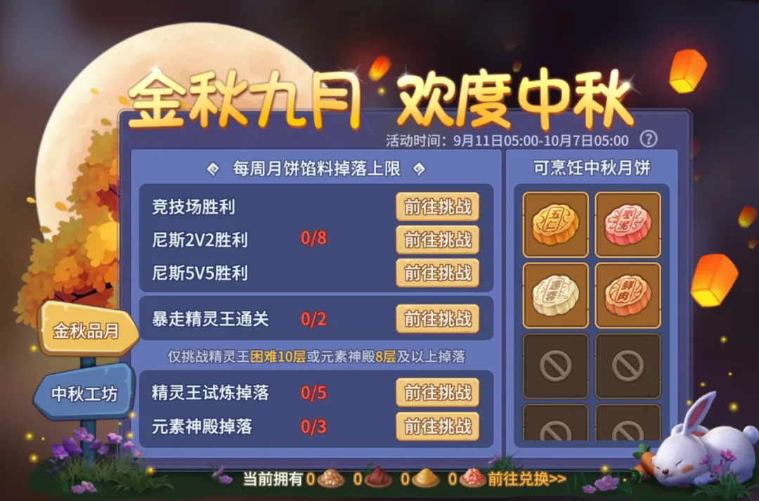 - 暴走精灵王可获得随机月饼馅料,每周上限2个。
