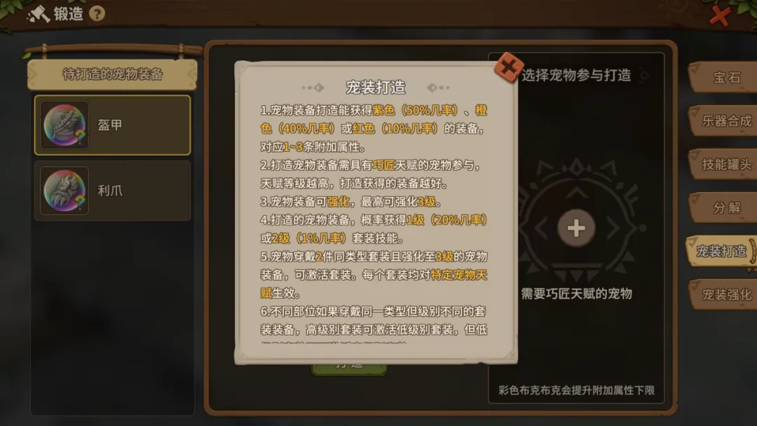 答:宠装打造需要使用【巧匠】天赋的宠物,例如布克系的【布克布克】。如果使用彩色布克布克进行宠装打造,会比使用其他品质的布克布克打造出的装备下限值更高。具体可以通过游戏-百科进行查看。