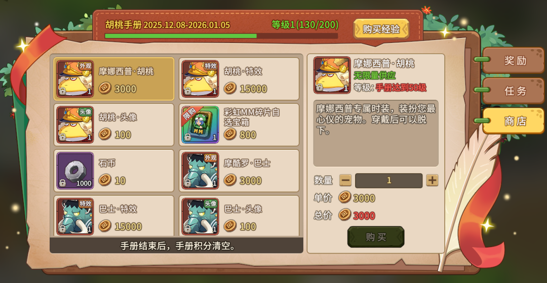 满级后溢出的手册积分可以在手册商店内兑换此前在手册中上架过的皮肤,还有没拿到的爱宠皮肤可以在此获取哟~