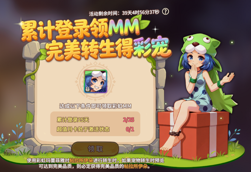 本服新增 【登录送机暴彩虹MM】 活动,在活动期间累计登录25天(需月卡状态),即可直接领取 【机暴彩虹MM*1】。使用它进行转生,即可获得完美品质的帖拉所伊朵,让你一步到位拥有最强攻宠。