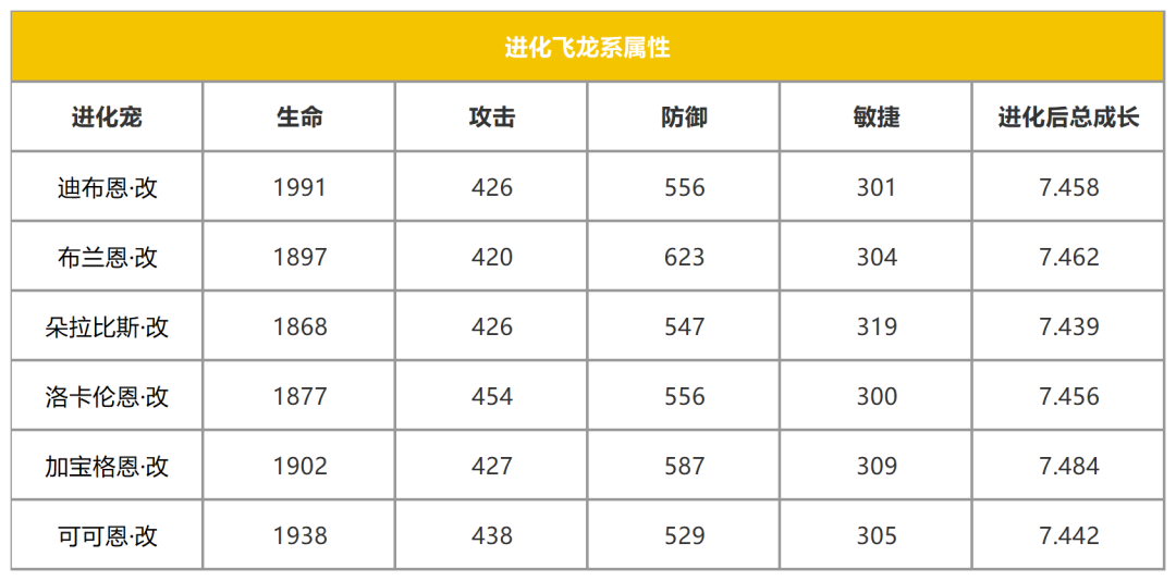飞龙系共6只宠物,均可进化,但各自在属性数值上有所差别,可以根据自身队伍构成和战术需求,选择最合适的飞龙进行培养和进化。