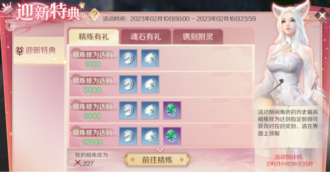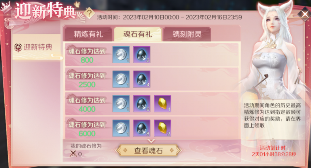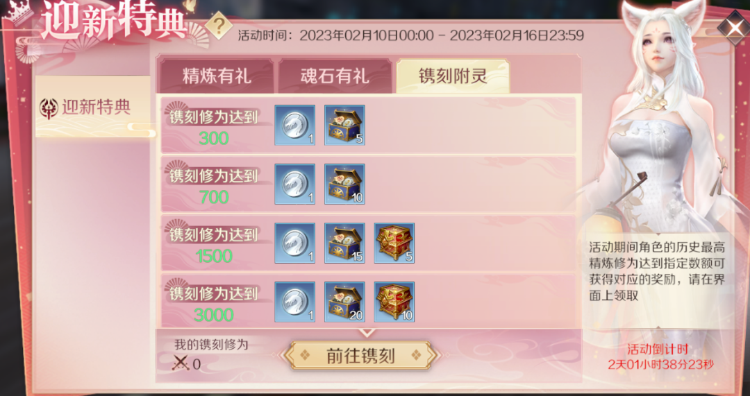 镌刻附灵中,修真者在活动期间,精炼修为以及魂石修为达到指定数额则可获得对应的奖励,超多