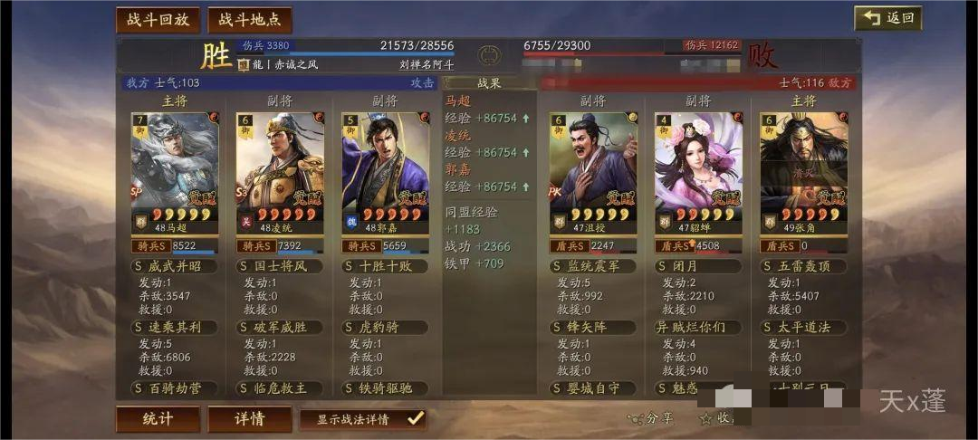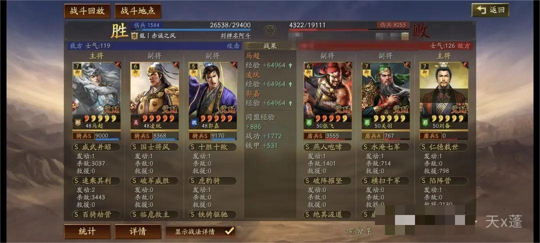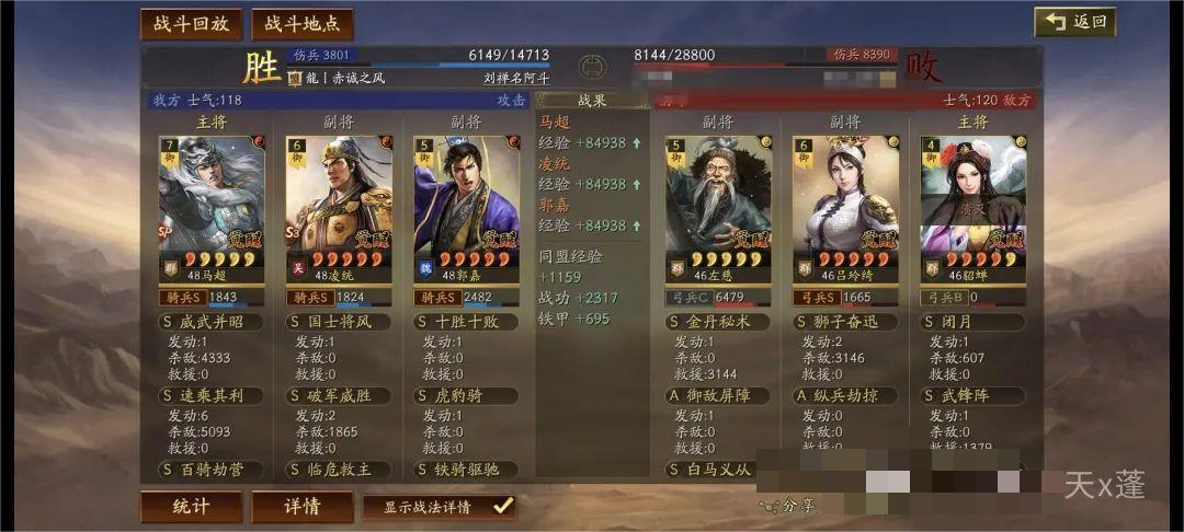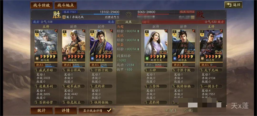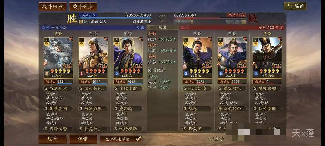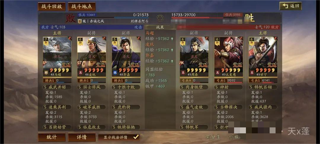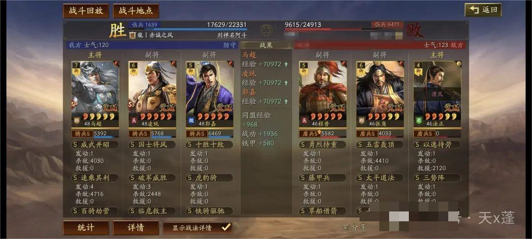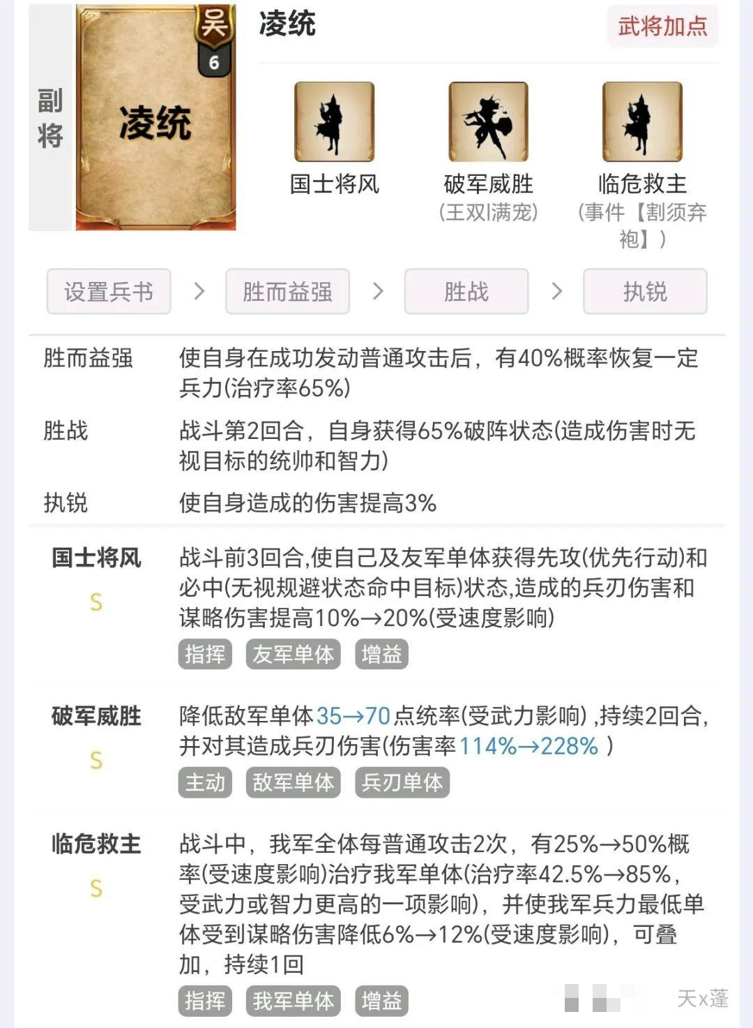 铁骑驱驰前两回合给予敌人遇袭,配合凌统先攻基本绝对先手!主动与突击战法发动,有概率降低敌人统率起到破防效果。