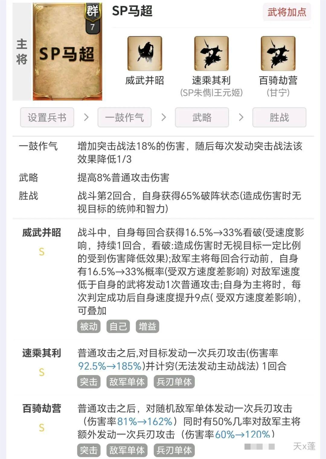 sp马超有看破敌人减伤的机制,所以打藤甲兵与一些乌龟壳般减伤队伍非常好用!敌军主将行动时,与每一名敌军进行判定有几率给予一次普攻。sp马超的机制非常有效,带控制类突击战法有几率控制全场!