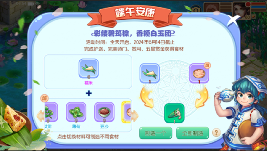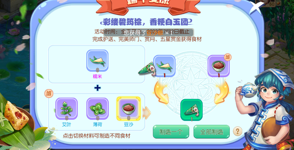 6月8日0点-6月14日23:59,少侠们每日可通过参加护送、完美师门、赏月、五星赏金等任务获得粽子食材,在包粽子界面选择自己想要制作的粽子,点击制作即可获得粽子礼包。