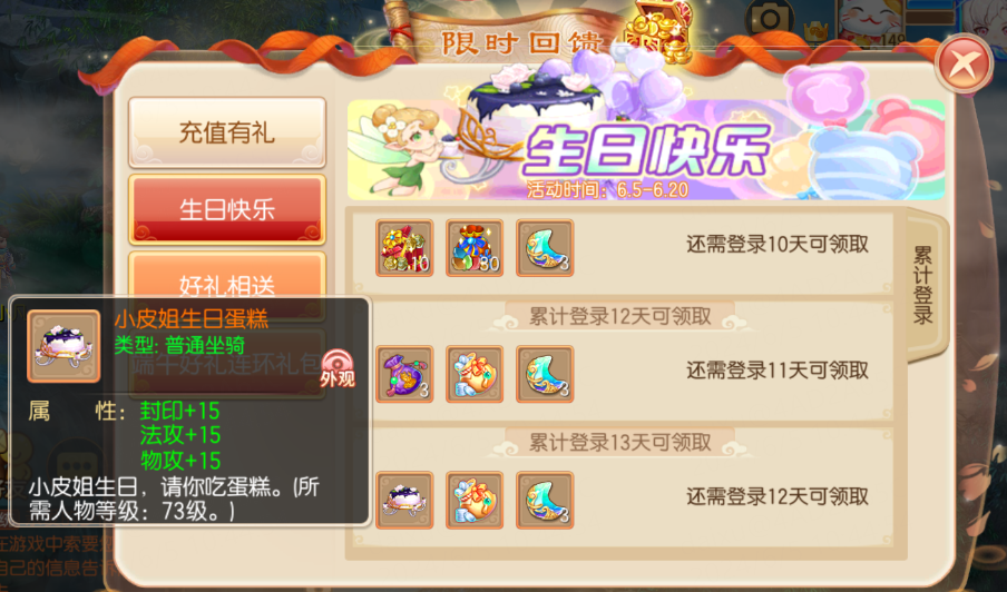 6月5日-6月20日活动期间,各位少侠只要前往【生日快乐】活动界面领取祝福,就能获得超值好礼!在最后一日还会获得珍稀坐骑哦~