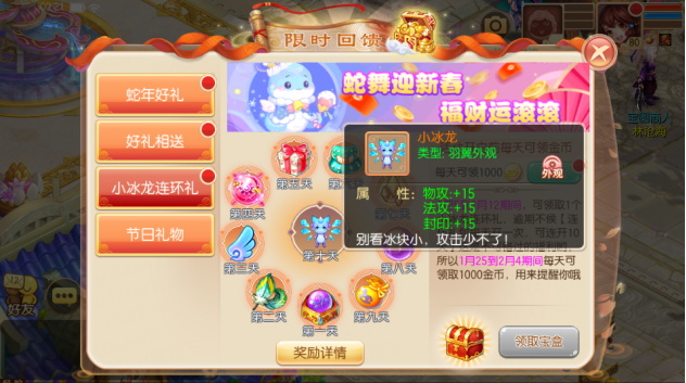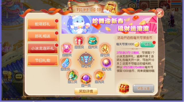 1月25日-2月4日,活动正式开启之前,少侠们每日可以在【小冰龙连环礼】活动页面领取1000金币。2月5日-2月12日,活动正式开启期间,每天可领取1个小冰龙连环礼,每个礼包每天限开一次,可连续开10天,千万不容错过哦!