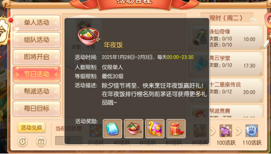 活动期间,等级在30级以上的少侠可以前往节日活动界面,单人参加【欢乐小年夜】活动,届时将有丰厚好礼等你领取哦~