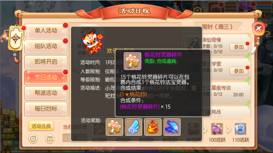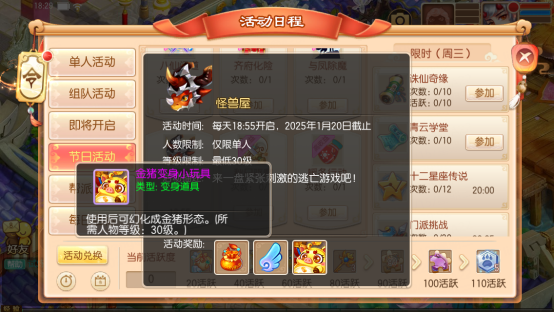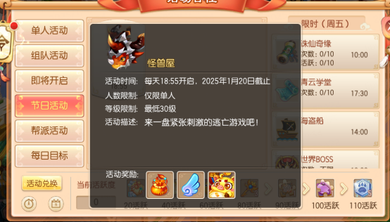活动每天18:55开启,截止到1月20日为止,等级在30级以上的少侠可以前往节日活动界面,单人参加【怪兽屋】活动,丰厚奖励等你来领!