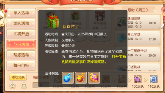 活动将于2月10日截止,等级在30级以上的少侠可以前往节日活动界面,单人参加【新春寻宝】活动,神兽碎片、魔兽碎片等着少侠来领!