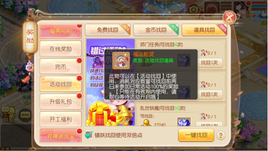 新年期间可使用道具找回往期日常奖励,让你过年轻轻松松,再也不用担心我错过日常活动啦!