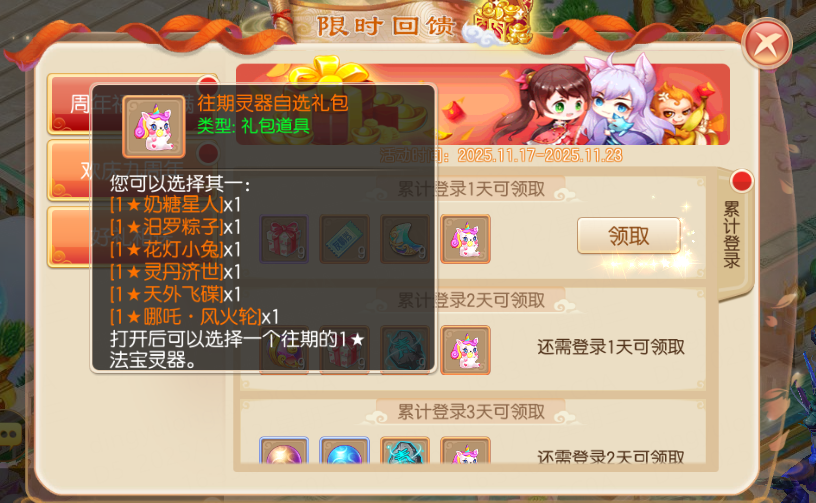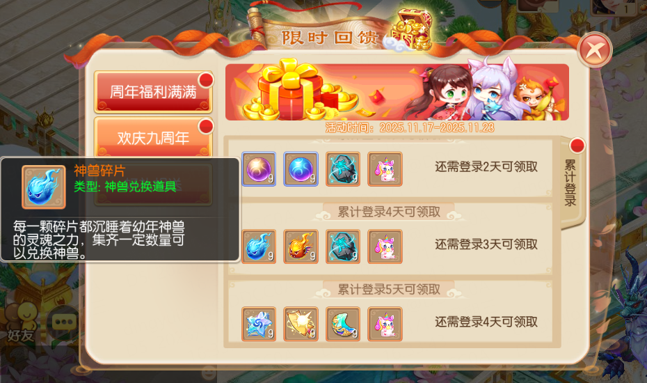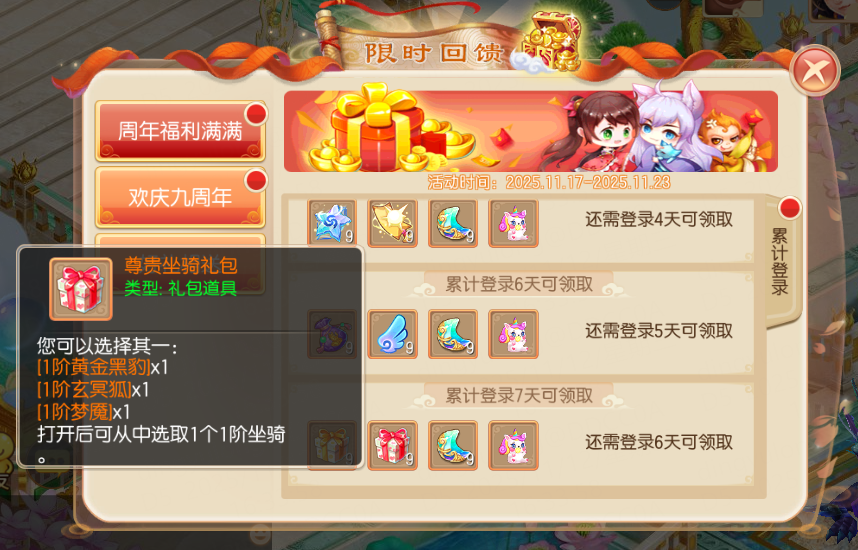 周年福利满满,绝对不容错过!2025年11月17日-11月23日,等级≥20级的少侠每日登录游戏,即可领取登录奖励!