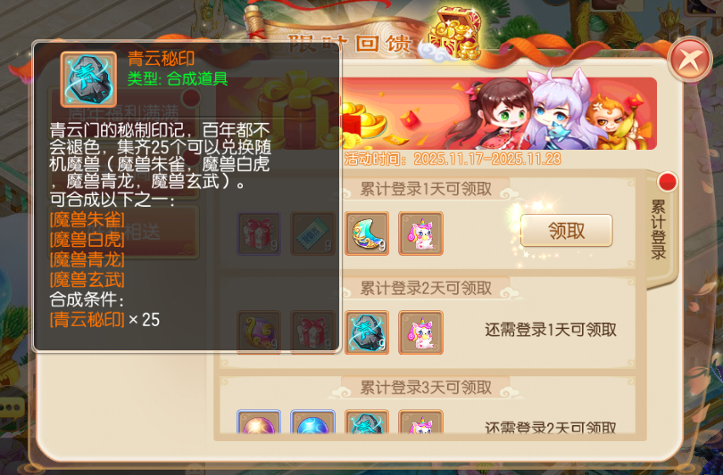 11月20日:神兽碎片*9、魔兽碎片*9、青云秘印*9、往期灵器自选礼包*1;