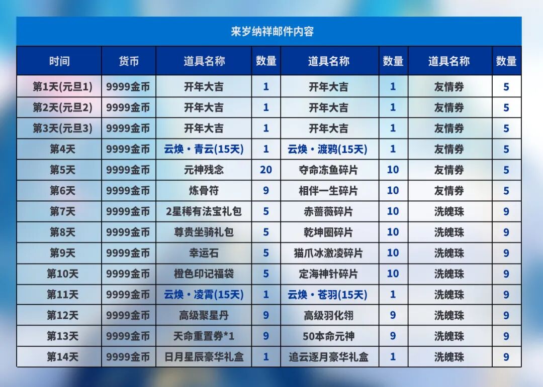 新元开景运,春祺溢满堂。康宁常作伴,百福永呈昌。从2026年1月1日-1月14日,每日登录游戏,即可领取梦诛来岁纳祥邮件奖励,奖励包含金币、开年大吉、元神残念、尊贵坐骑礼包等超值豪礼!每日具体邮件奖励内容如下: