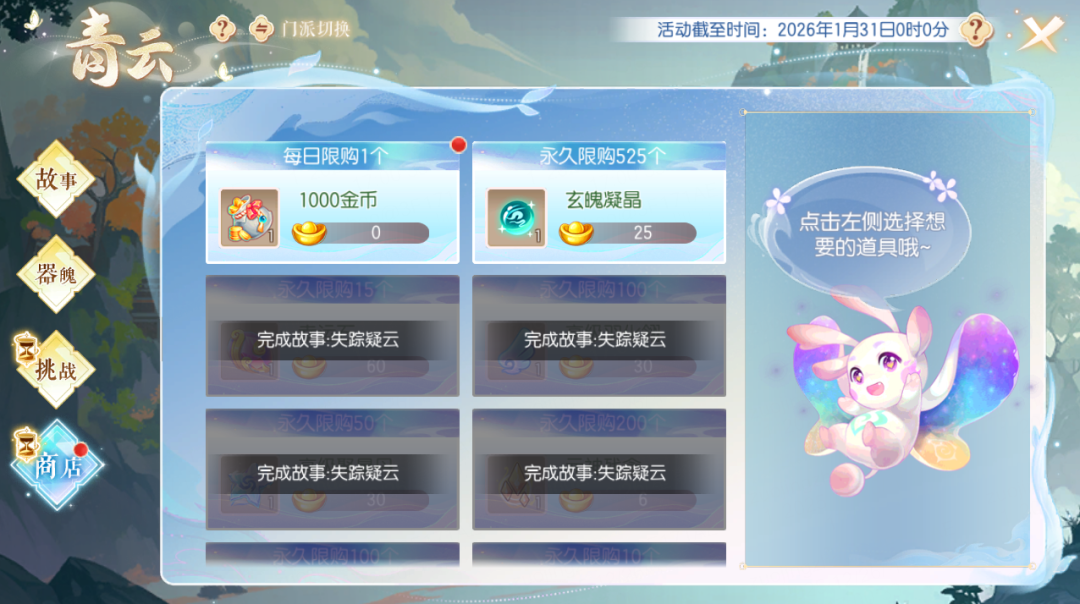 随着故事进度的推进,少侠们可以在活动商店解锁更多折扣商品,如金币、玄魄凝晶、幸运石、高级羽化翎、高级聚星丹、元神残念等好礼。