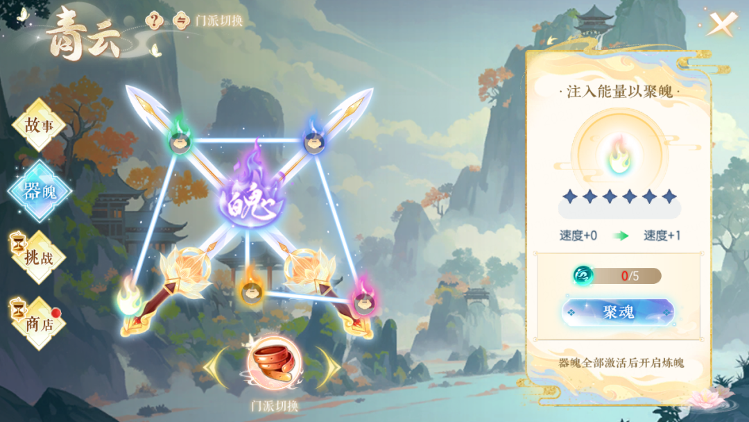 完成故事节点可获得重要养成道具“玄魄凝晶”,“玄魄凝晶”可用于任意部位装备的聚魄操作,每成功激活一个器魄装备则可以获得指定的属性加成,属性加成随着聚魄等级的提高而提高。当五个器魄全部激活后即可开启洗魄以及炼魄玩法,大幅度提高装备的附加属性值。