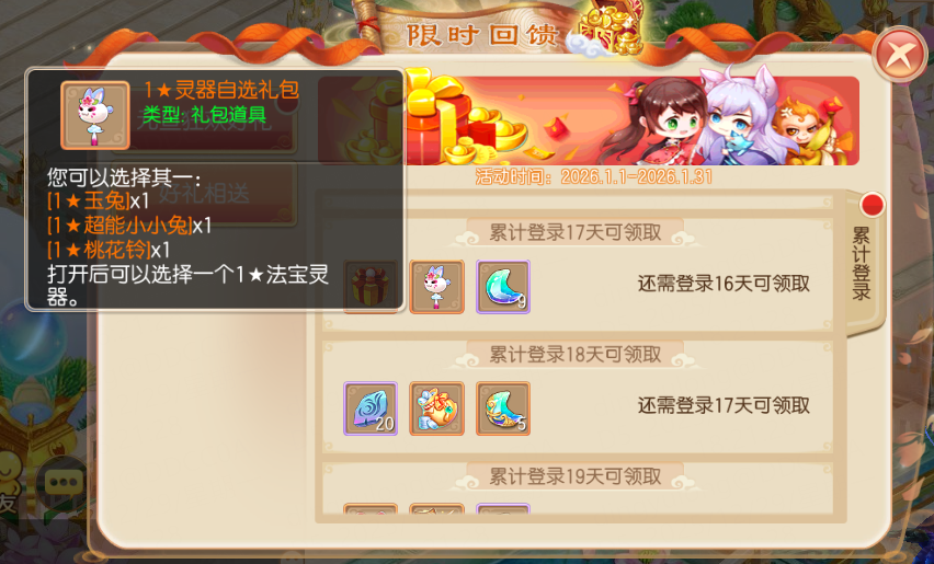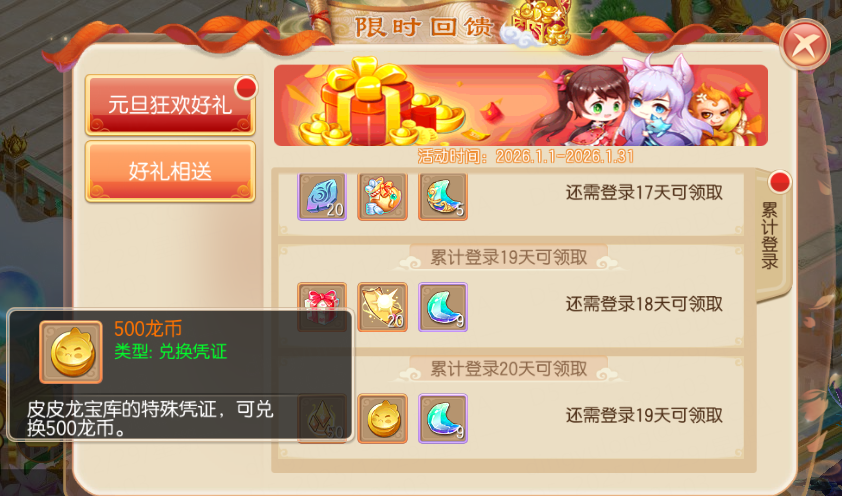 2026年1月1日-1月31日,等级≥20级的少侠,每日登录即可领取登录奖励!奖励持续20天,除了丰富的各类珍稀道具外,还包含超级书福袋、6级龙晶礼包、大量募灵石、大量募灵玉、光华大礼包、2★稀有法宝、1★灵器自选礼包、尊贵坐骑礼包。最后一天惊喜送出:500龙币!